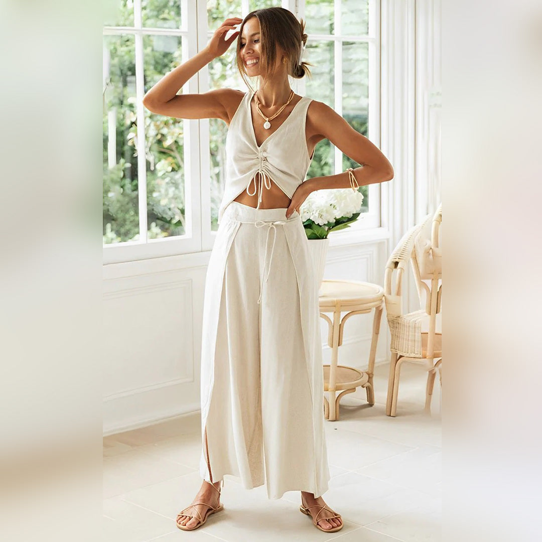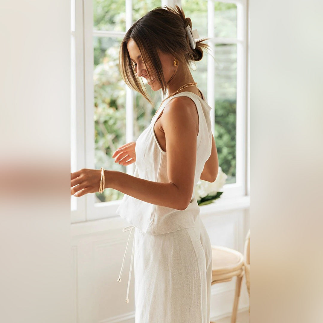Ontdek ALENA Stijlvolle top en broek set, een echte uitnodiging om te ontsnappen en te ontspannen. Het is zorgvuldig gemaakt van ademende, duurzame stof met een moderne look voor een comfortabele zomer.