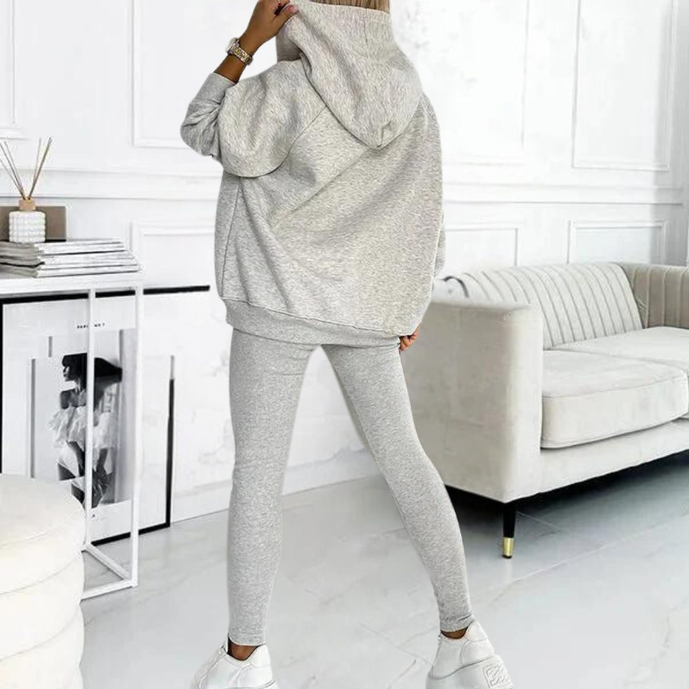 Het ensemble bestaat uit een geribde top, een oversized hoodie en een geribde legging met een hoge taille, die samen of apart een fantastische indruk maken.