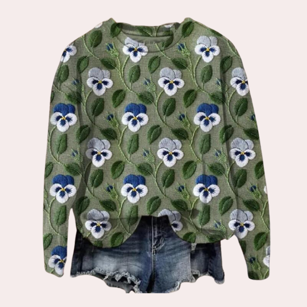 De Cora Damestrui met Bloemborduurwerk weerspiegelt jouw stijl. Met zijn levendige bloemenprint benadrukt deze trui niet alleen de schoonheid van de natuur, maar heeft hij ook een moderne uitstraling die perfect bij het seizoen past.