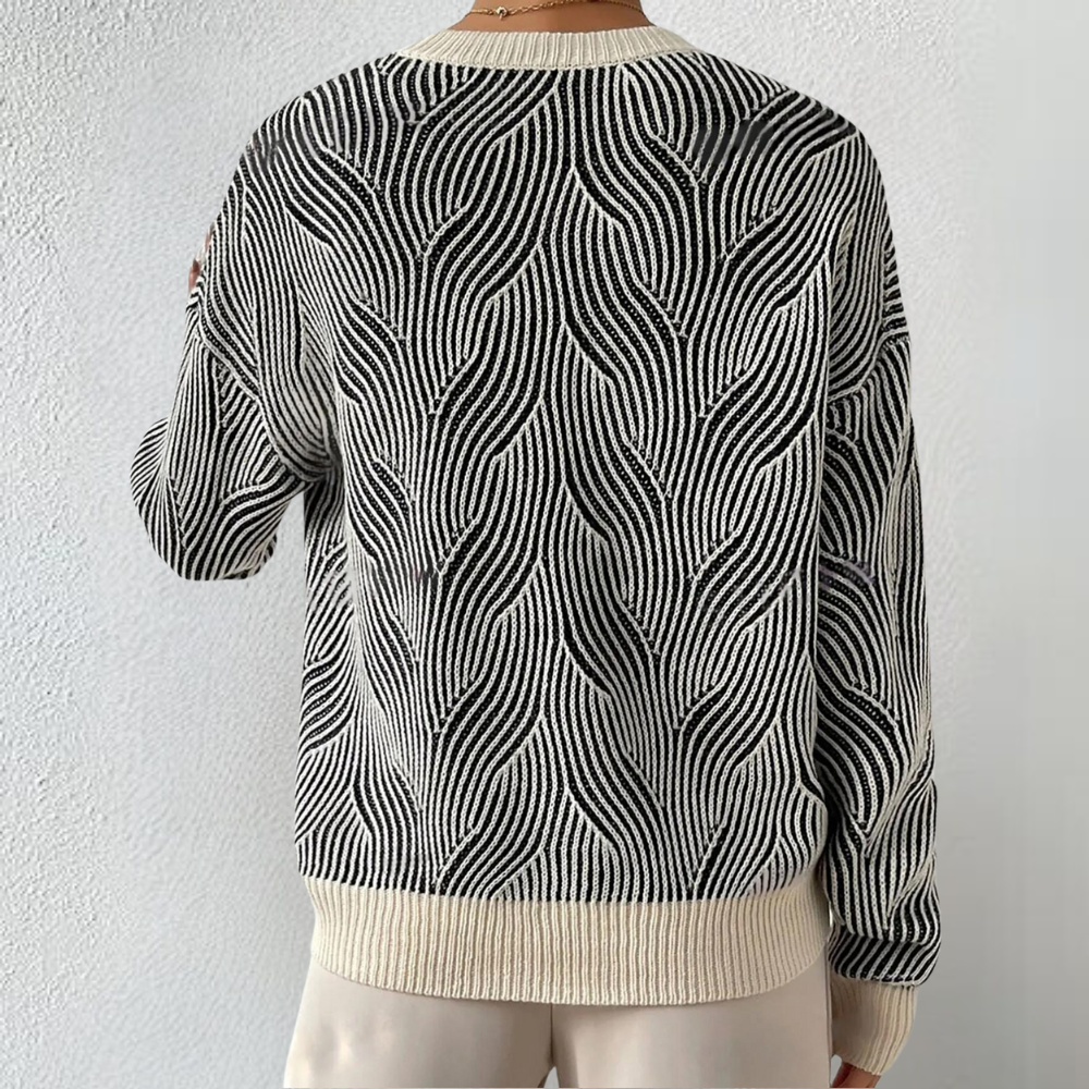 Stijlvol Ontwerp: De verfijnde structuur en het unieke breipatroon zorgen ervoor dat je er altijd goed uitziet in deze trui.