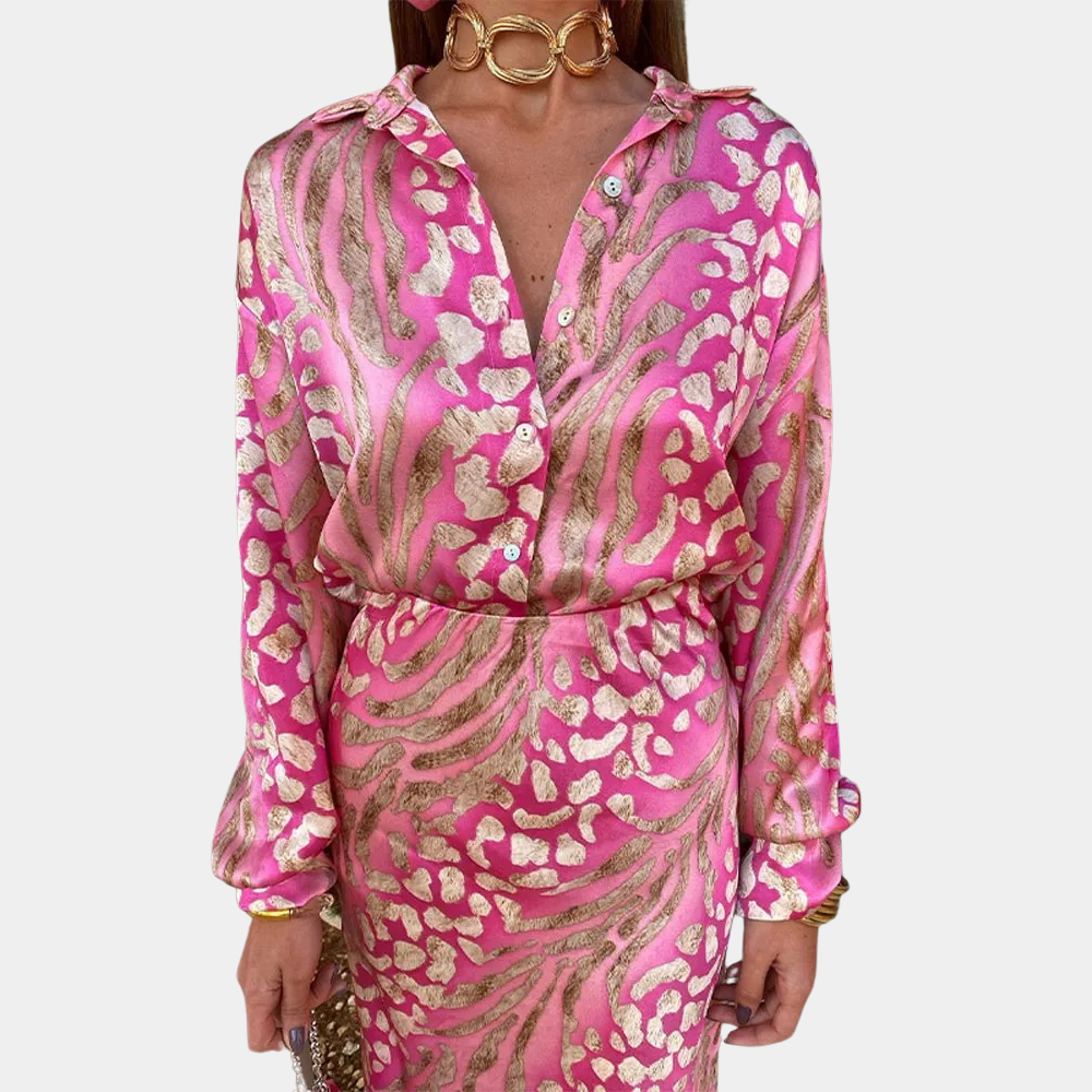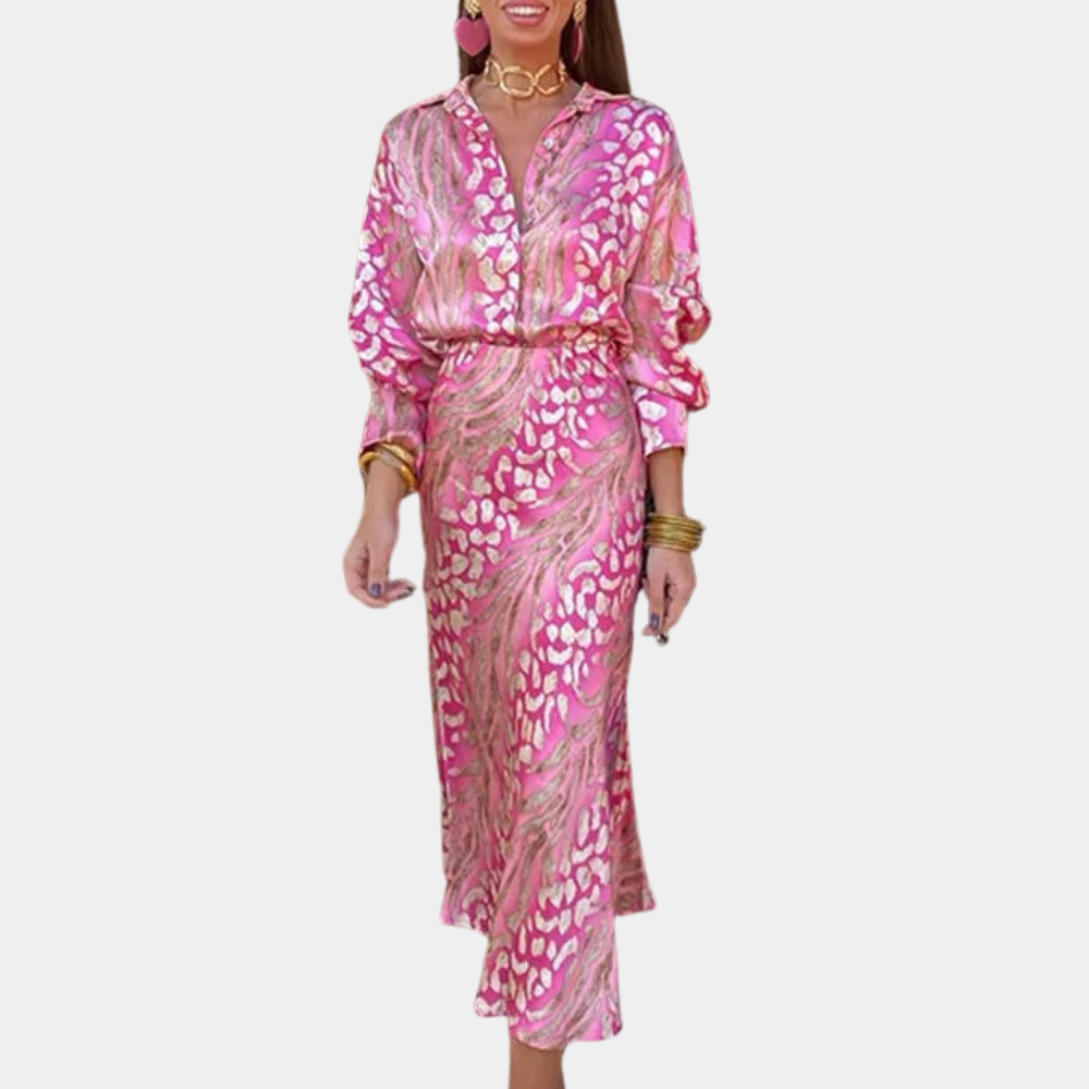 Treed binnen in de wereld van tijdloze elegantie met onze Gessica Elegante damesjurk- een geraffineerde en kleurrijke toevoeging aan je garderobe. Deze zomerjurk omarmt je met zijn luxueuze patroon en lange mouw waardoor je in elke omgeving schittert.