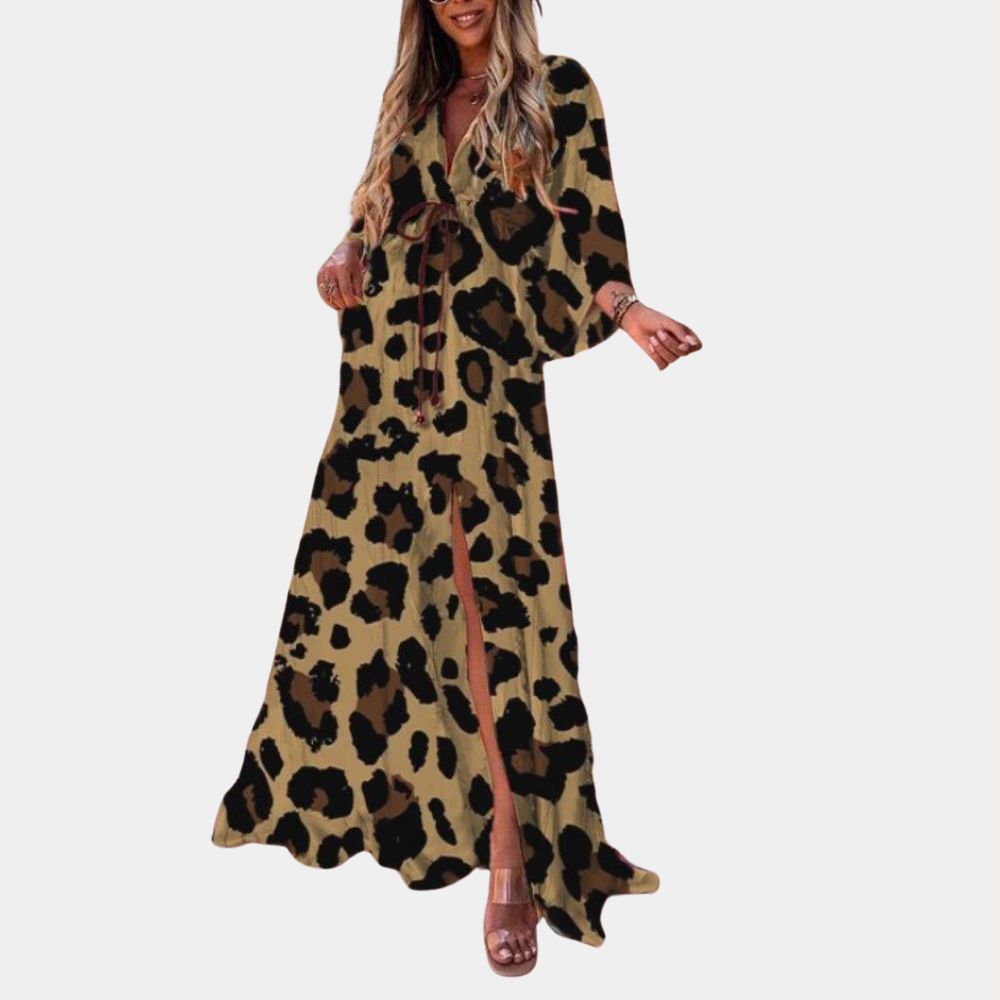 Deze Kaitlin Stijlvolle dames maxi-jurk met v-hals heeft een stijlvol design met een V-hals, lange mouwen en een verleidelijke split bij de rok. De Kaitlin Stijlvolle dames maxi-jurk met v-hals met bloemen- en luipaardprints maakt een fashion statement en is perfect voor het voorjaar en de herfst. Met zijn flatterende pasvorm en sexy split is het de ideale keuze voor elke vrouw die elegantie en stijl wil belichamen.