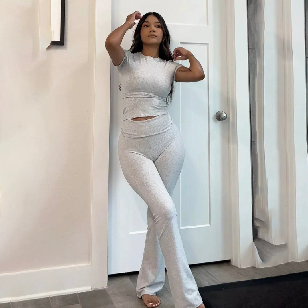 De MATILDA loungeset met een shirt met lange mouw en een bijpassende legging broek voor dames in de kleuren grijs en blauw is de perfecte keuze. Deze tweedelige set dames biedt het ultieme comfort voor thuis, terwijl het er ook nog eens stijlvol uitziet! Ontdek nu deze must-have 2 delige set dames voor jouw dameskleding collectie!