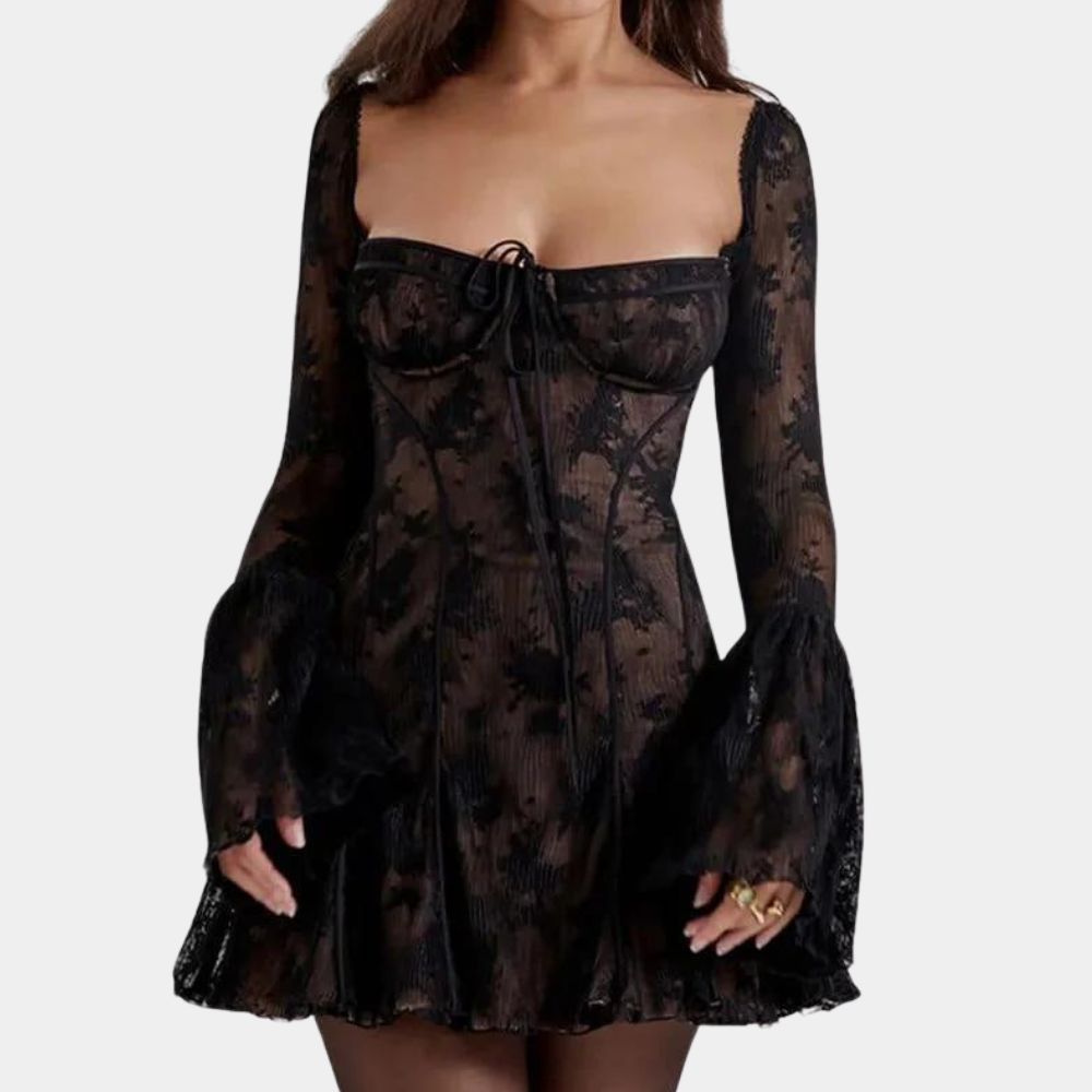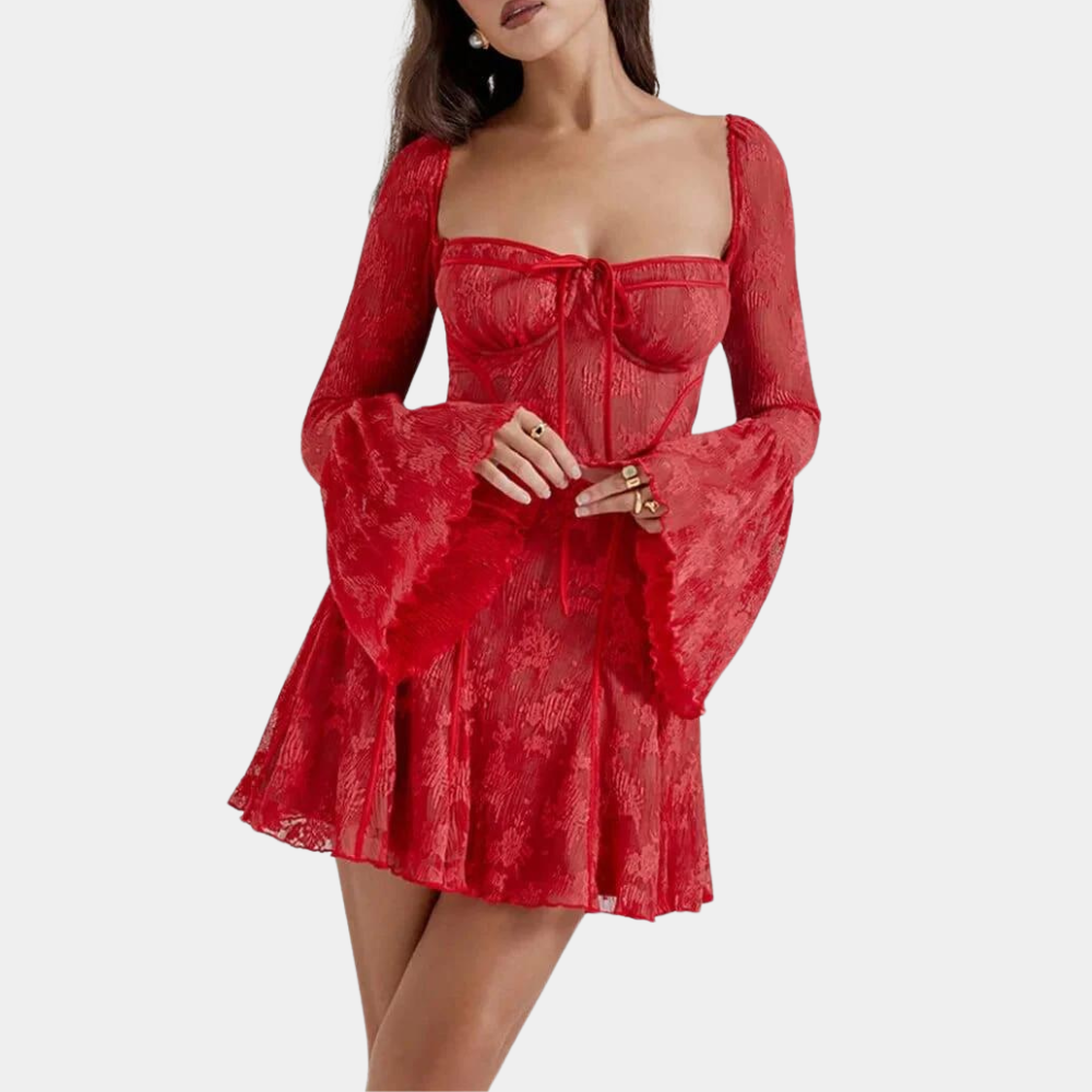 De Nikolina - Trendy mini jurk met kant voor dames biedt je een romantische elegantie voor bijzondere gelegenheden. Met zijn A-lijn snit en verfijnde klokmouwen straalt hij vrouwelijke charme uit en laat je voelen als een prinses.