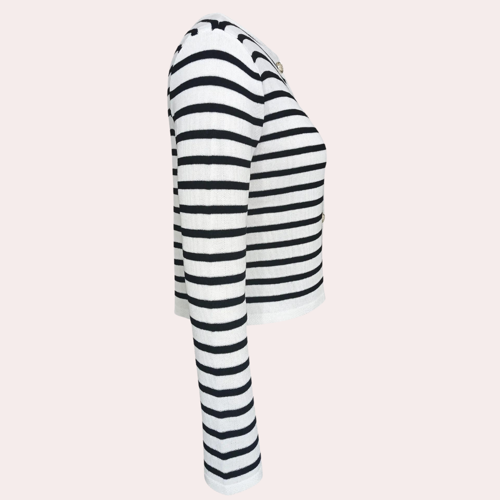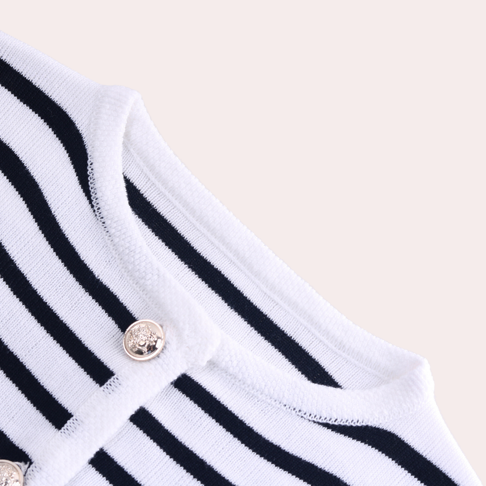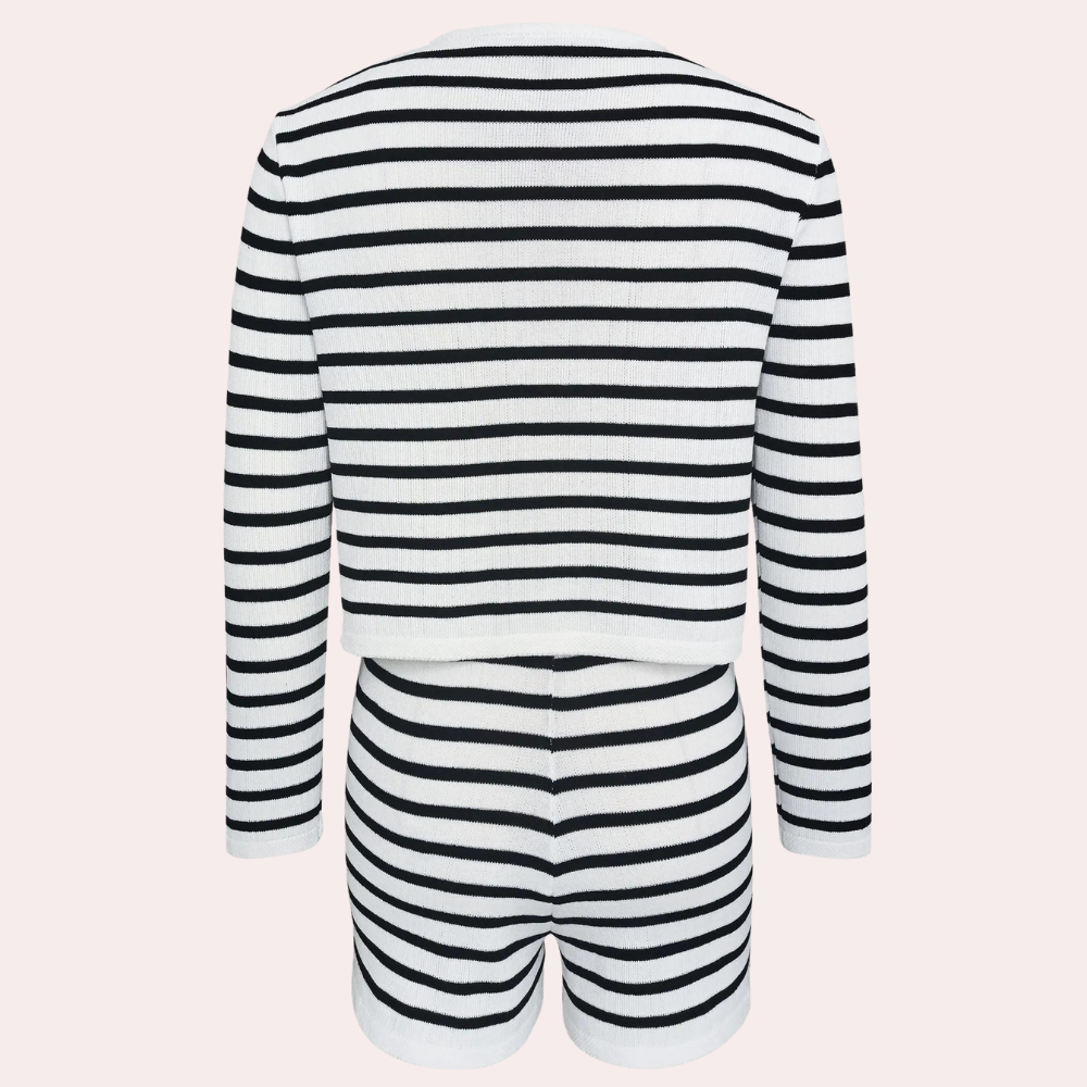 Deze elegante gestreepte cardigan en shortset bieden een verfijnde twist aan casual kleding. Perfect voor elke gelegenheid, combineren ze moeiteloos stijl en comfort.