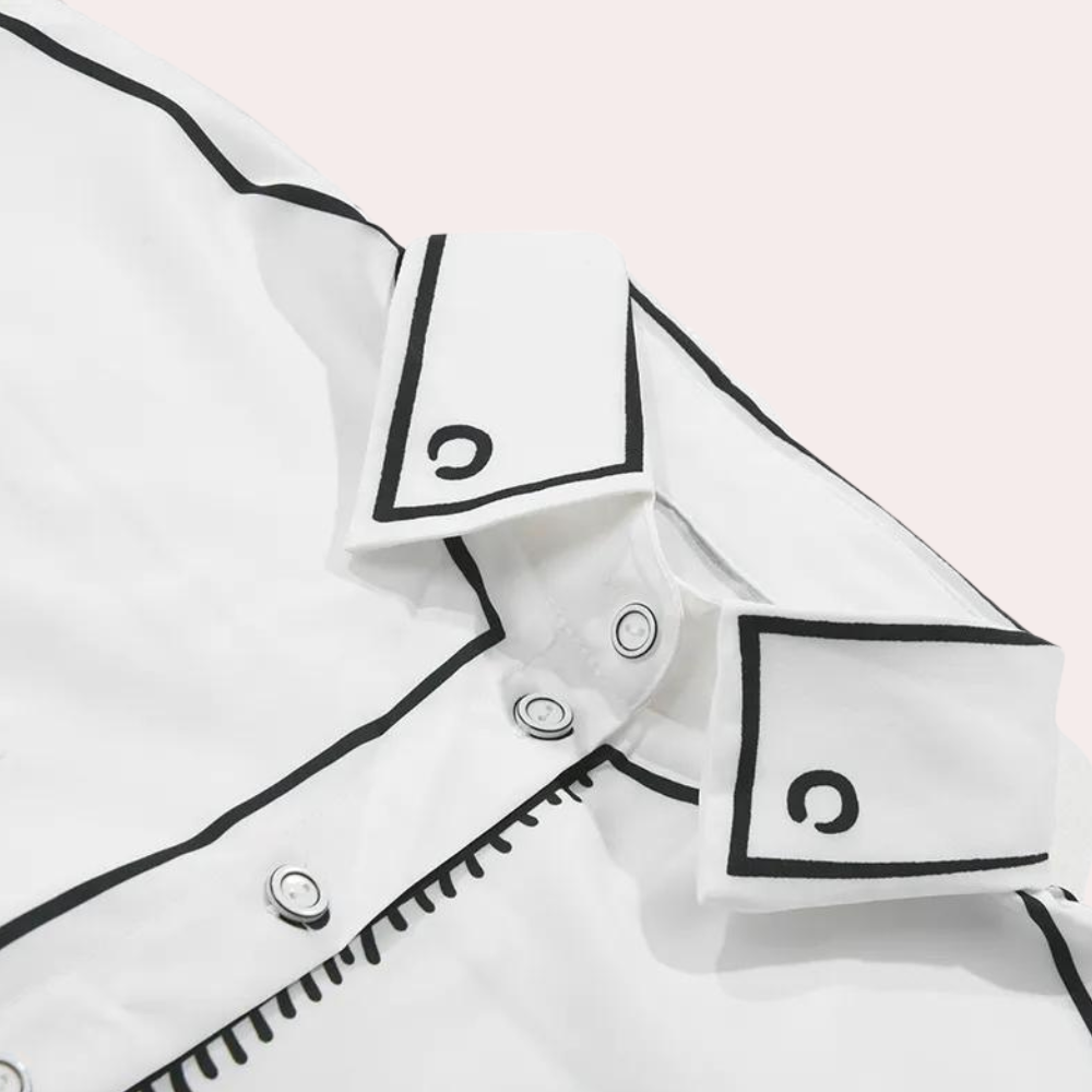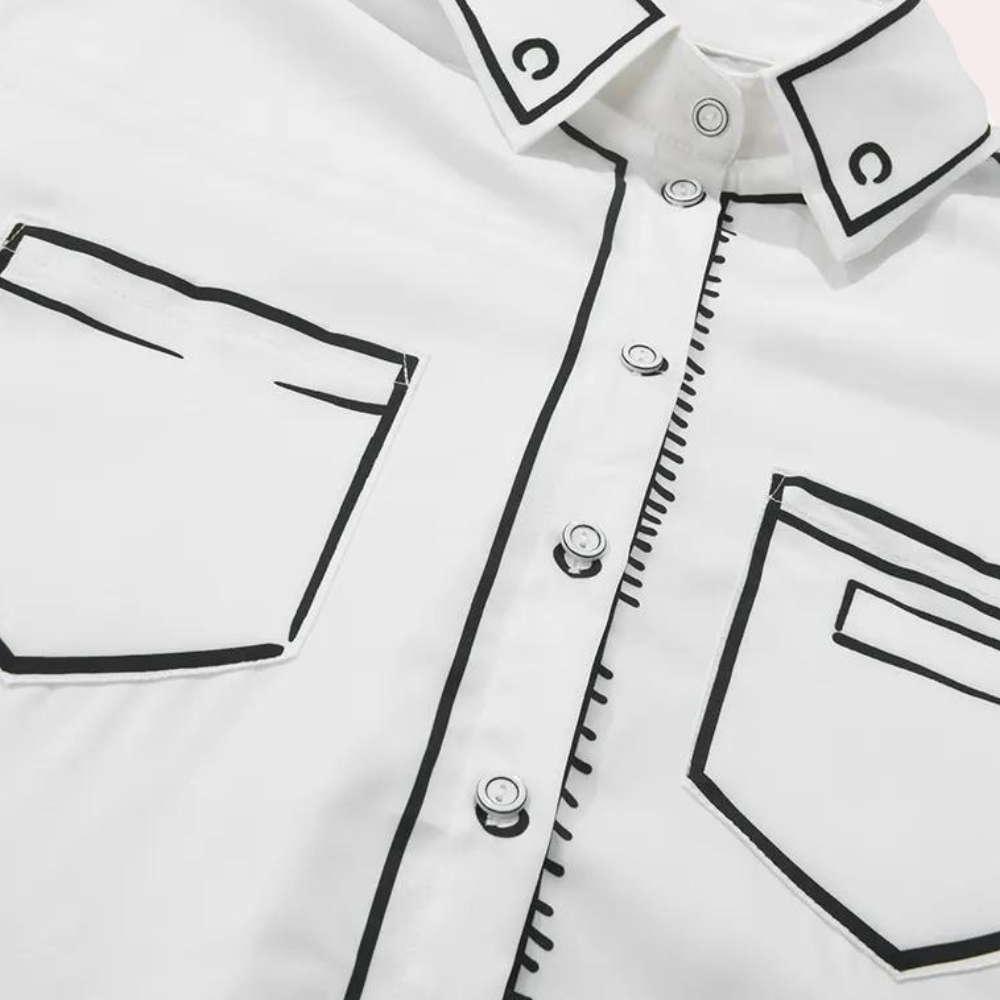 Ontmoet Zenobia, een relaxed, bedrukt langarmshirt voor vrouwen.
